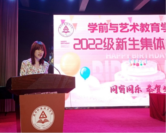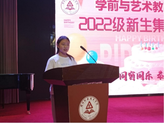 22级学前教育三班邢倩萌同学代表全体寿星同学们发言,感谢学校领导给予我们的关心、关怀和关爱,创造这样的一个温馨的氛围,希望我们今天在生日会上许下的心愿都会像一颗颗希望的种子,让我们期待它发芽、成长、开花、结果。