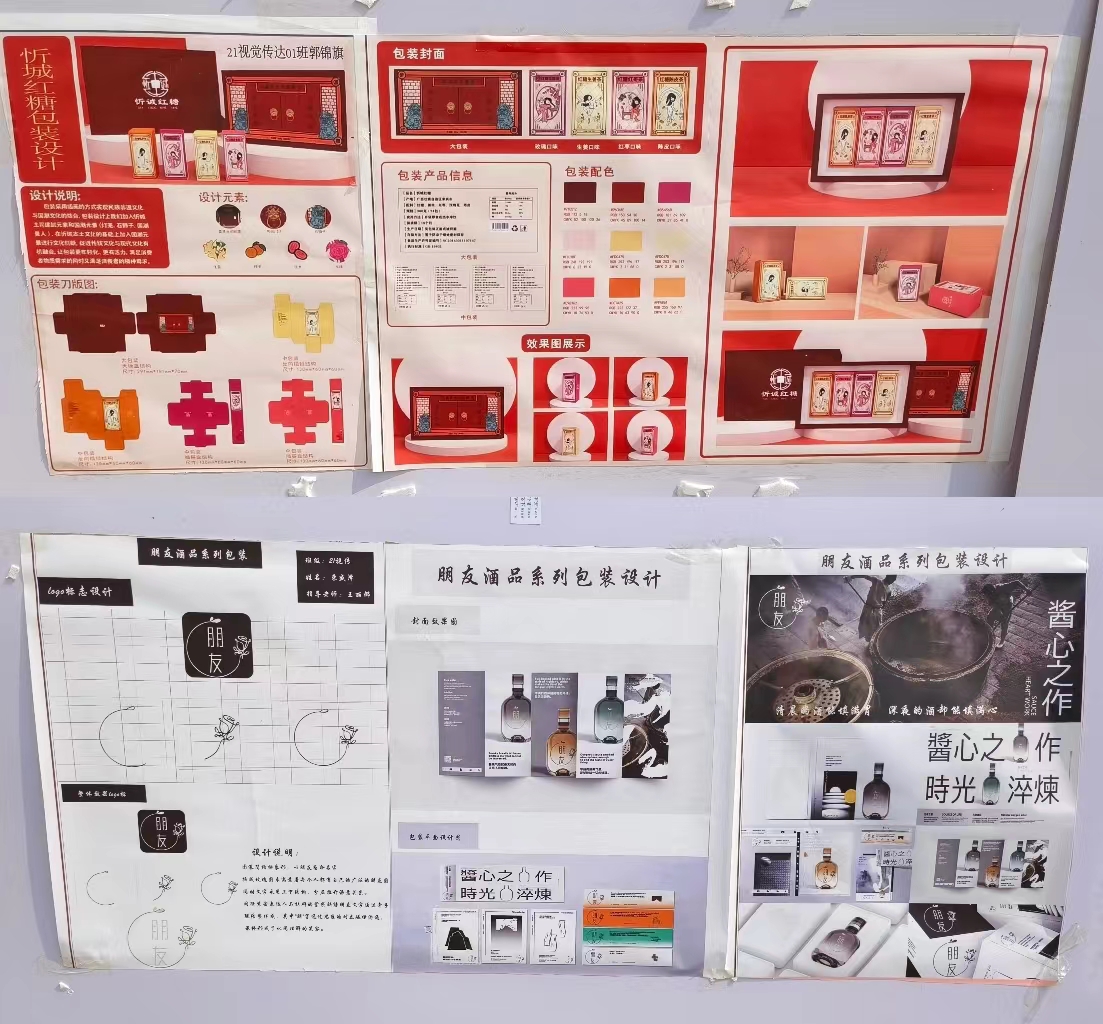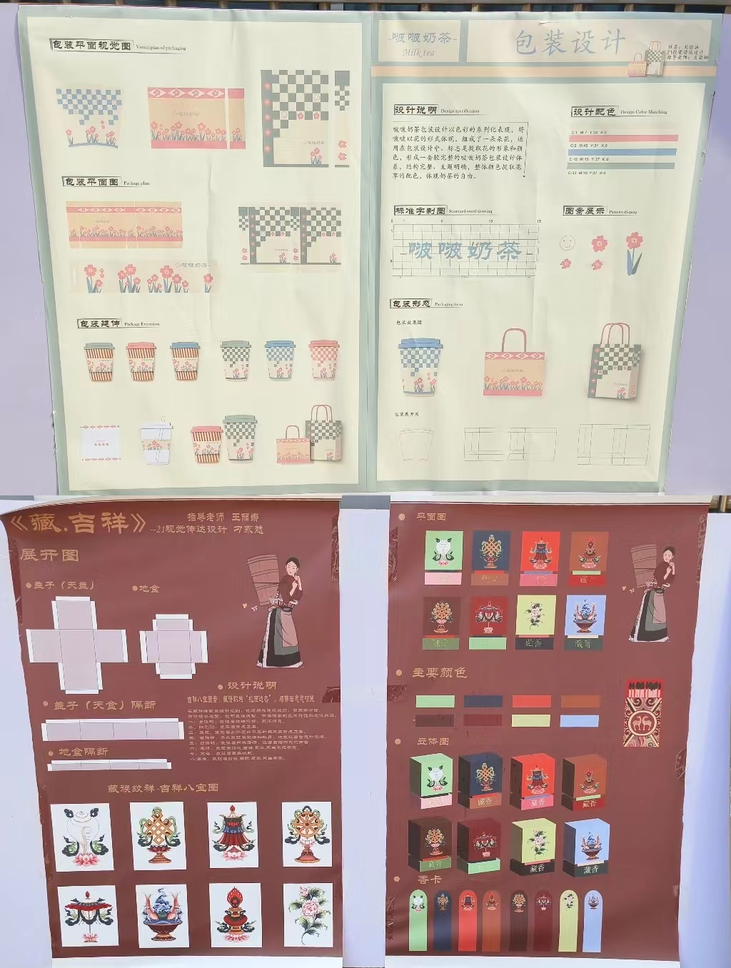 由美术教研室举办的21级视觉传达设计专业《包装设计》课程作品汇报展于5月31日在sunbet游戏官网广场展出。通过对本课程的学习,在任课老师王丽娜的指导下,同学们掌握了包装设计流程和包装设计的理念。本次汇报展共展出110多幅作品,作品内容丰富,有节庆礼盒、茶品系列、藏香系列、食品系列、母婴产品系列等包装设计。汇报展反映了同学们积极认真的学习态度和良好的学习成果。达到了以展促学,以展促教的教学效果。
